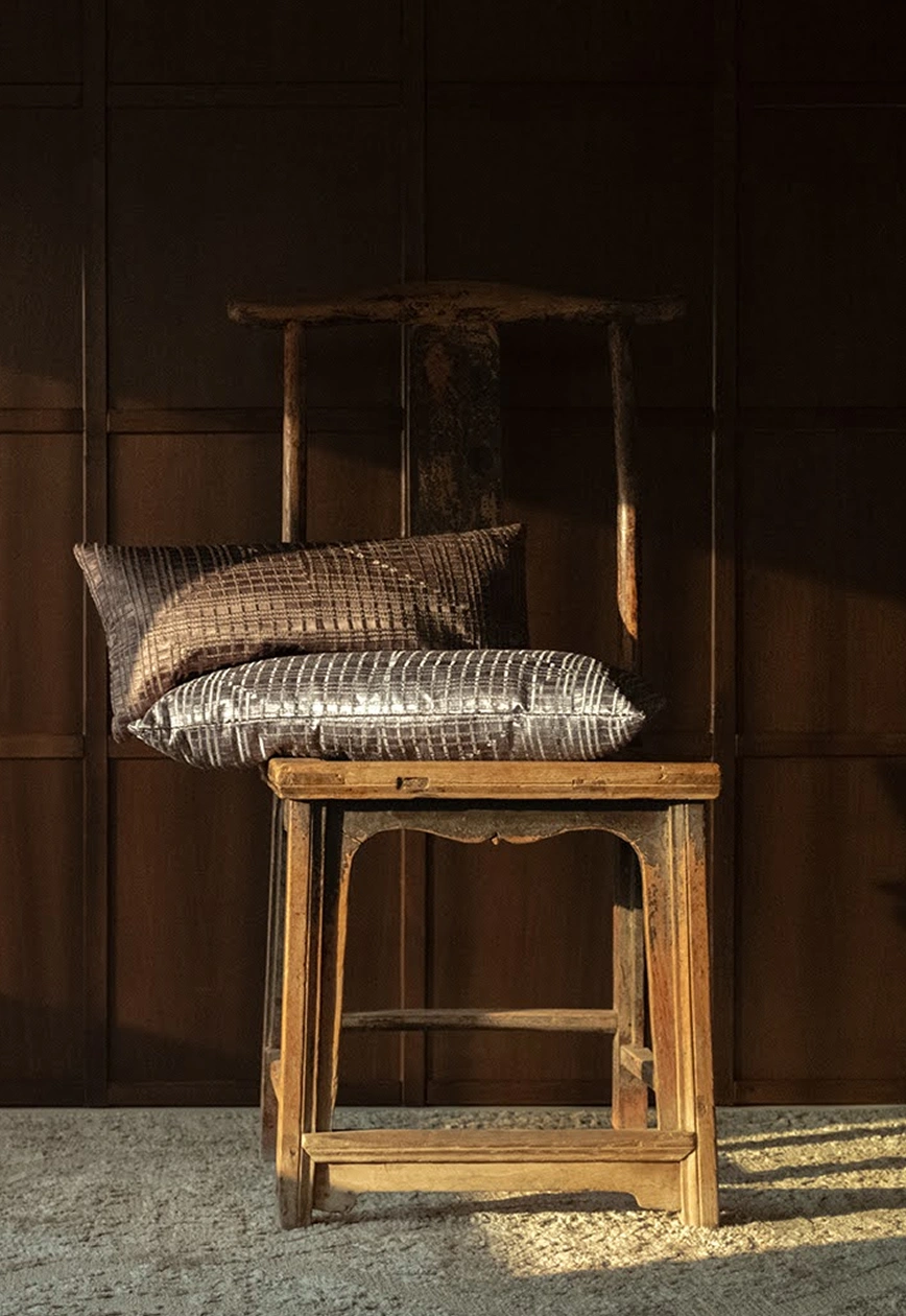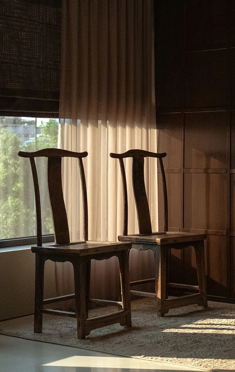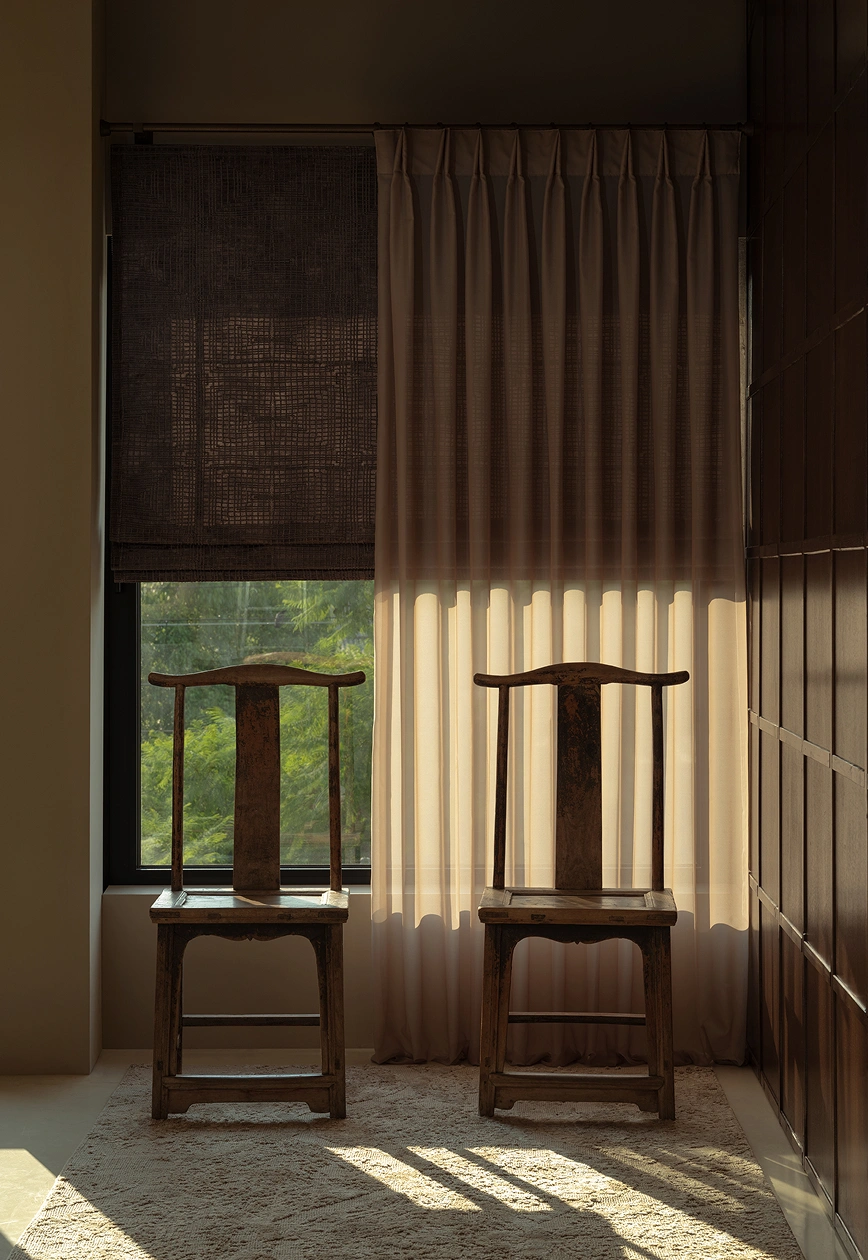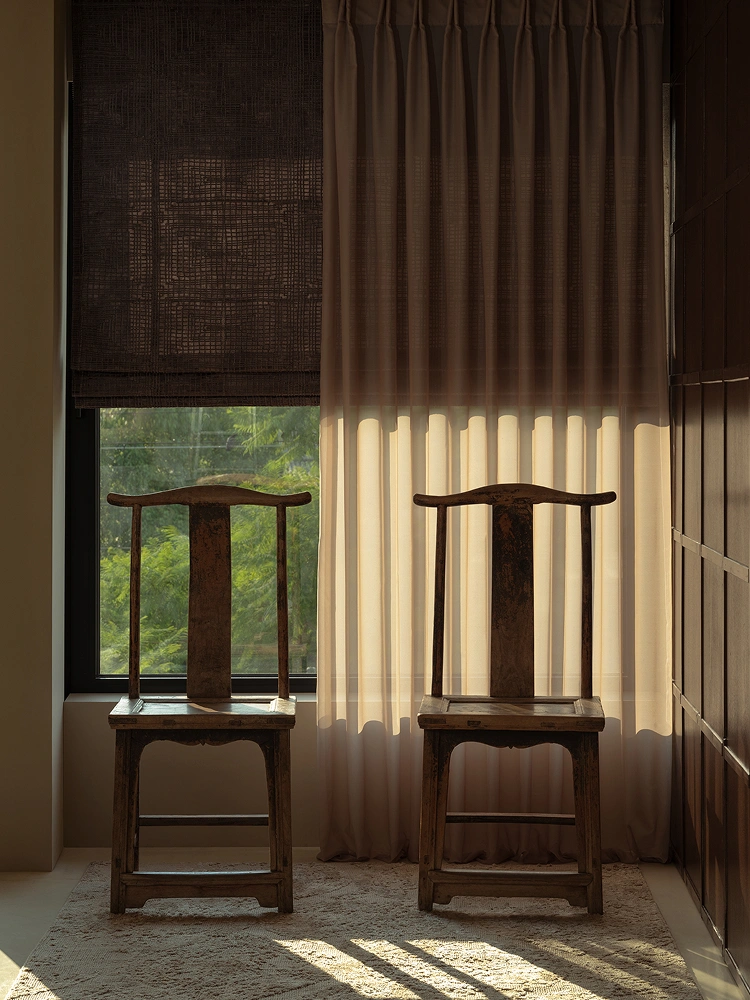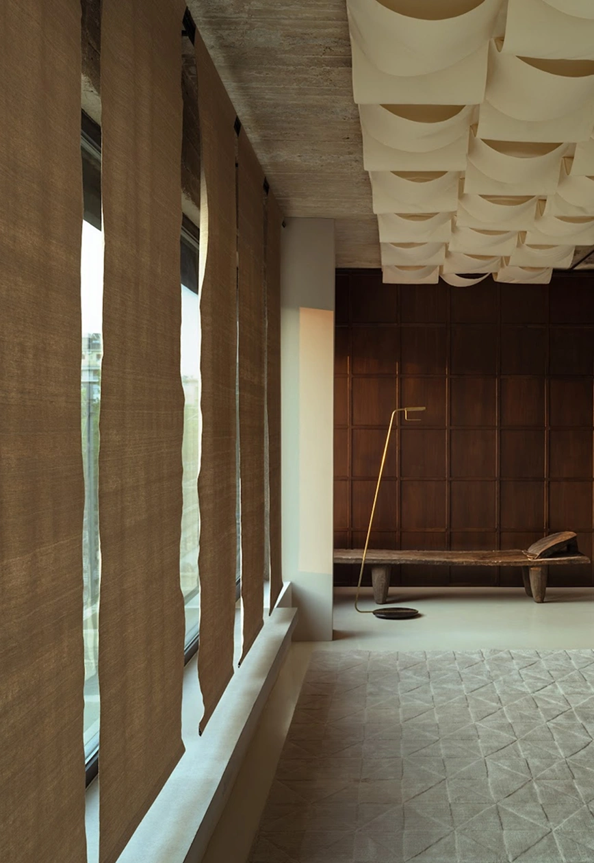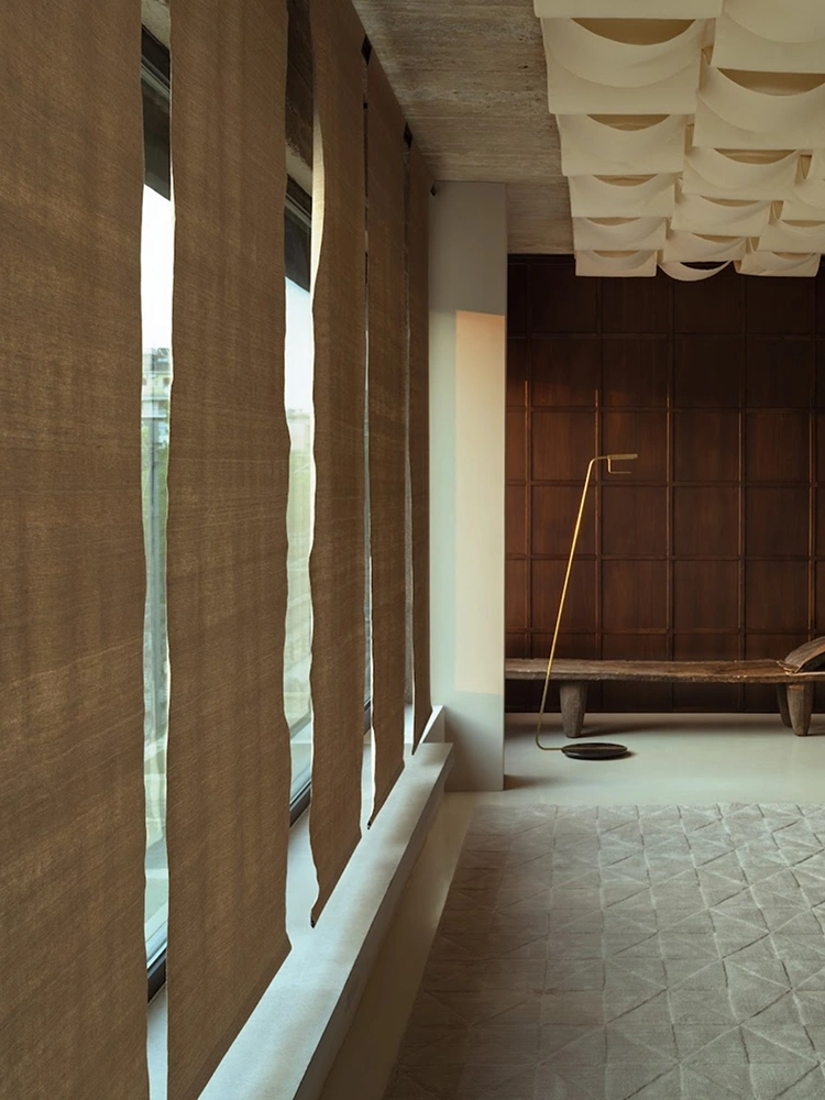 Каждая деталь создает ощущение связи с окружающим миром. Игра света, проникающего через полотна японских панелей из матового шелка RUANO Sand, обнажает его структуру, напоминающую прожилки листьев. Земляные тона отражают природные оттенки. Рельефные формы текстильного декора на потолке из хлопка SUPINE Beige смягчают строгую графику интерьера. Ковер КУФРИ с геометрическим орнаментом в песочном оттенке создает уютное и гостеприимное пространство. Баланс рукотворного и природного усиливает чувство сопричастности.
