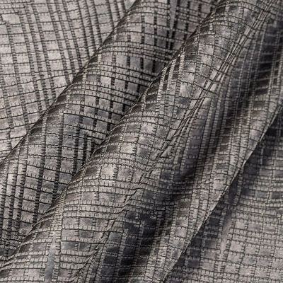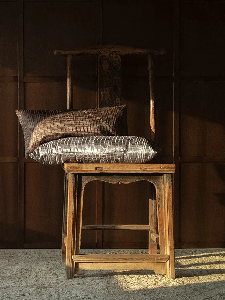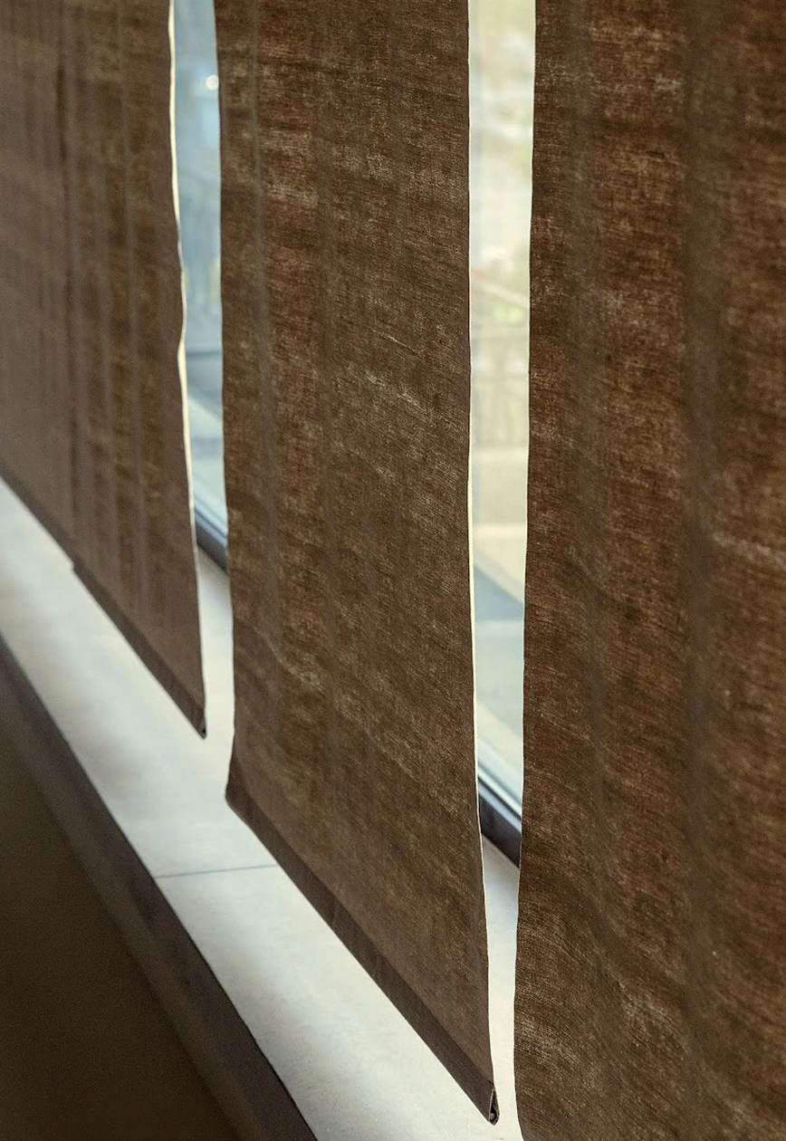 Окно лофта декорировано римской шторой из полотна с вышивкой MEIRO Bronze с текстурой древесной коры, которая дополнена плотным матовым тюлем с фактурой крепа VITRE Fuma. Винтажный стул с подушками из тканей MEIRO Bronze и MEIRO Onyx расположился на ковре ручной работы ДУФОУР.