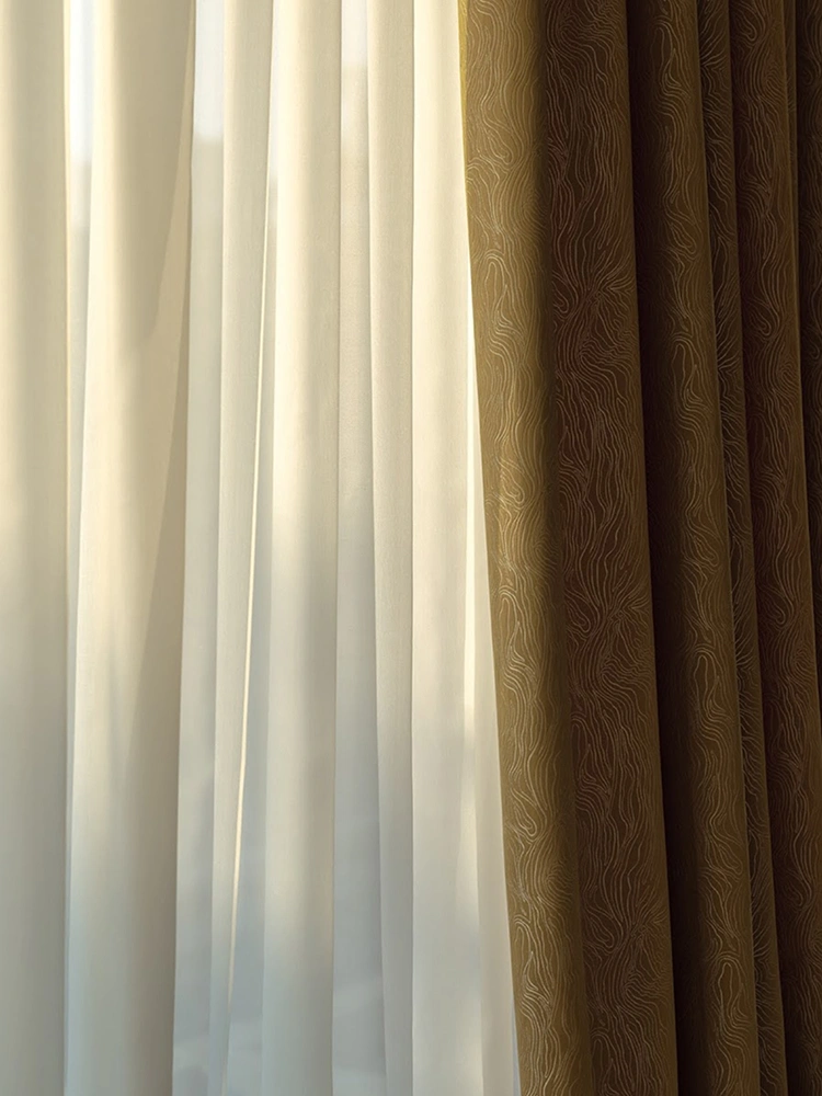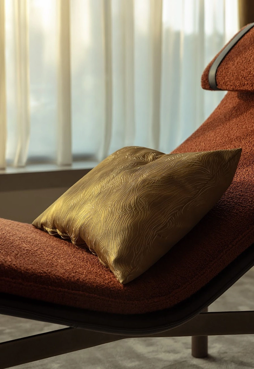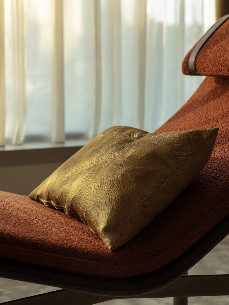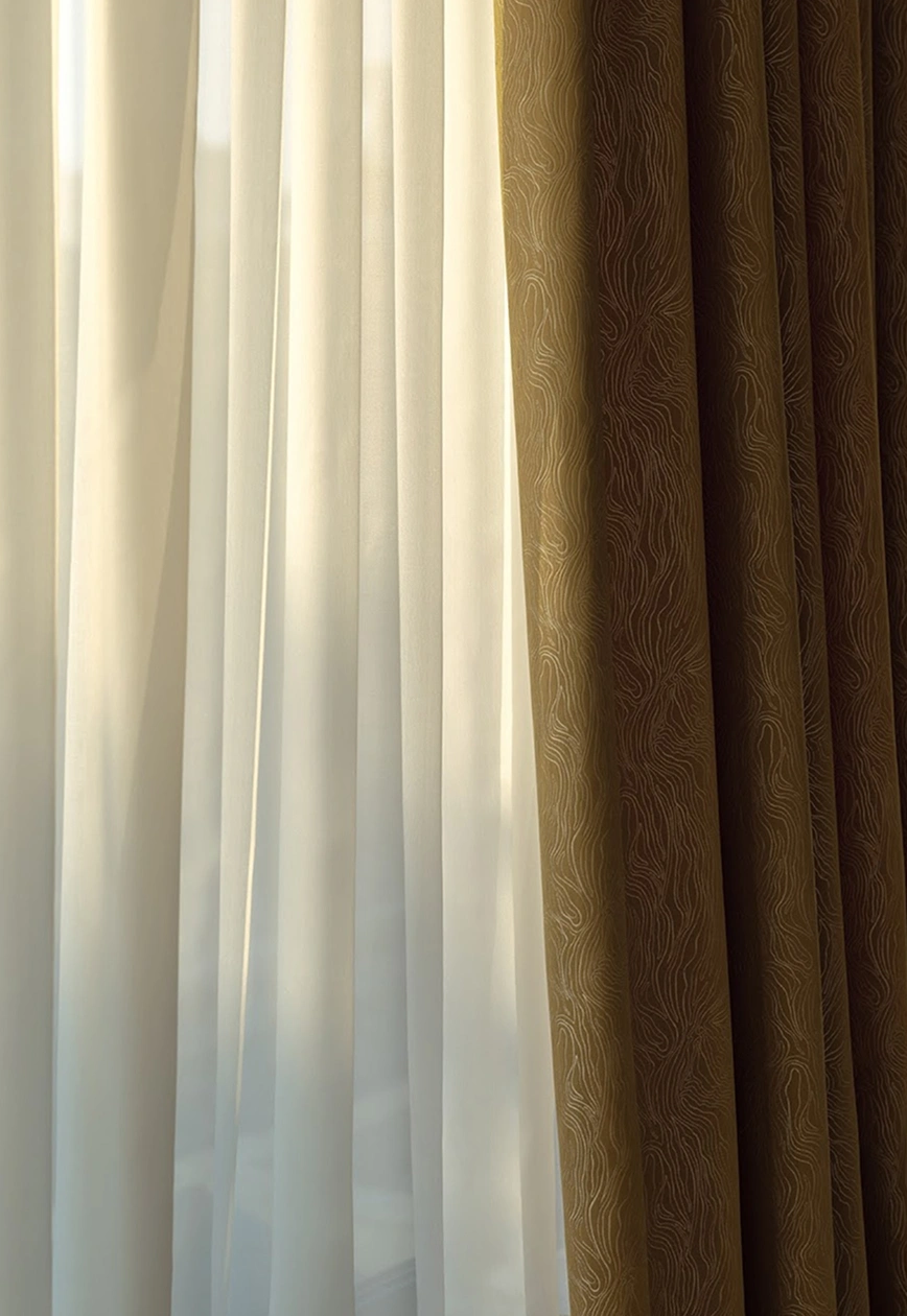 Пространство, преображенное теплотой и элегантностью тканей, меняет свой суровый характер. Нейтральная цветовая палитра, дополненная насыщенными яркими акцентами, приобретает глубину, проявляя суть многослойности современного комфорта. Шторы из жаккарда BOREALIS желто-золотого цвета с динамичным орнаментом обрамляют большое панорамное окно и привносят яркие краски в спокойную палитру интерьера. Тюль жемчужного оттенка VITRE Fuma мягко рассеивает солнечный свет, создавая ониксовое сияние глянцевого тераццо и шелковистого ворса ковра ручной работы ПАЛАНИ.