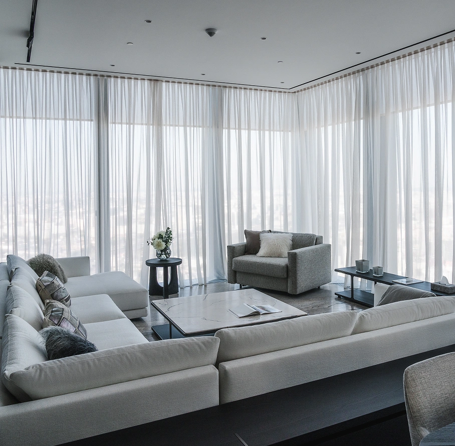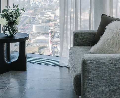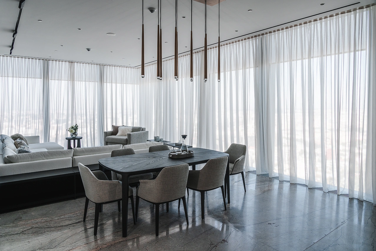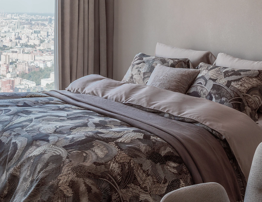 «В изысканный интерьер с панорамным остеклением требовалось привнести завершающий элемент — функциональный текстильный декор, соответствующий стилю и атмосфере пространства».