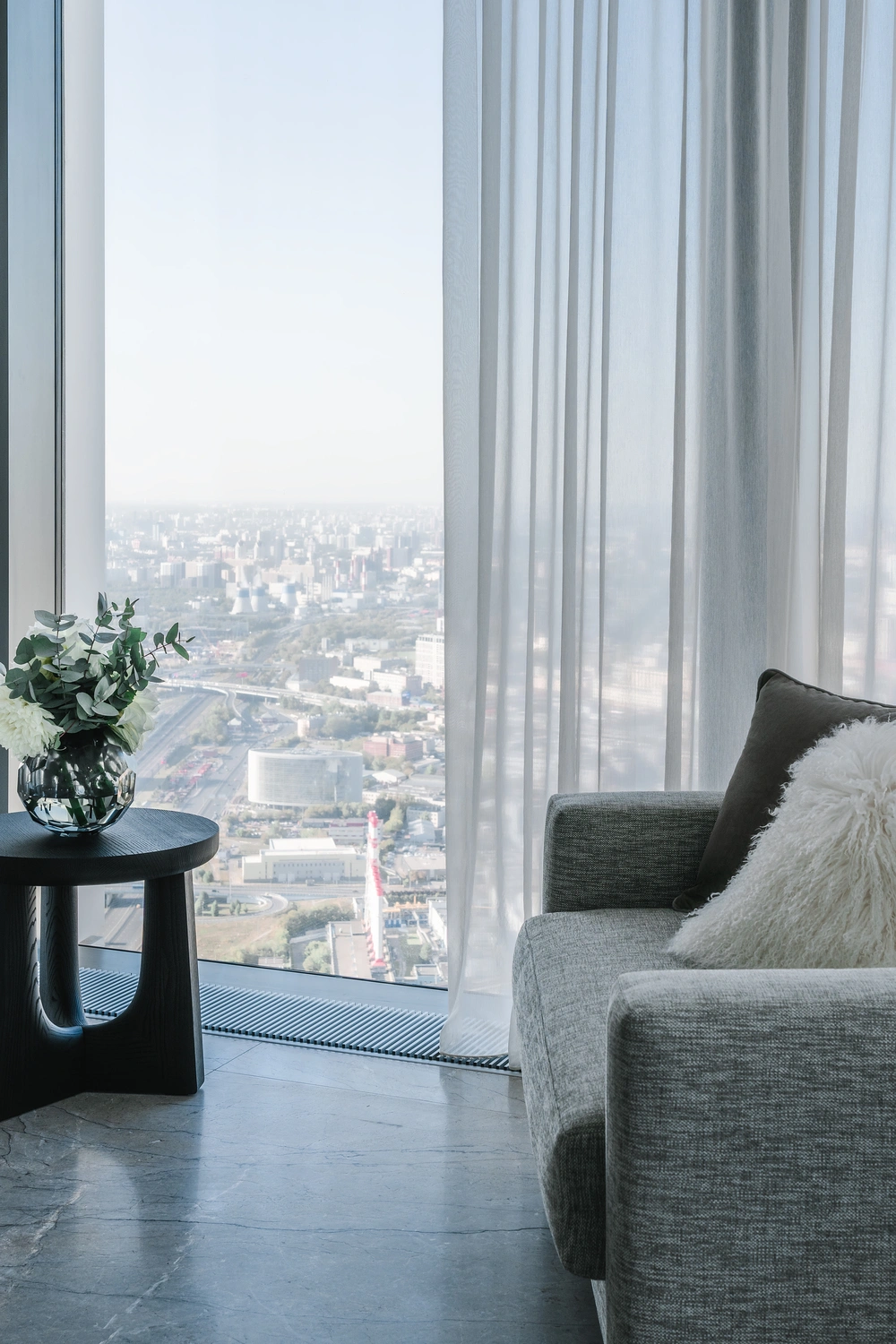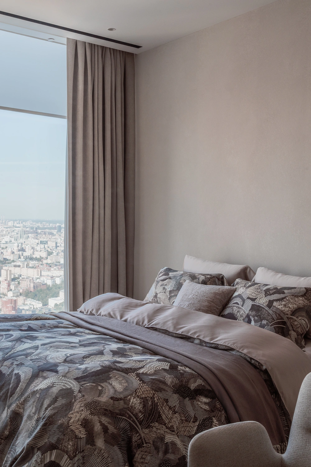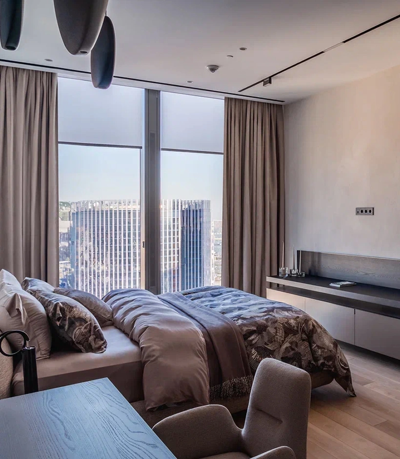 Текстильный декор изящно дополняет современный интерьер, превратив строгое минималистичное пространство в уютный городской оазис гармонии и безмятежности.