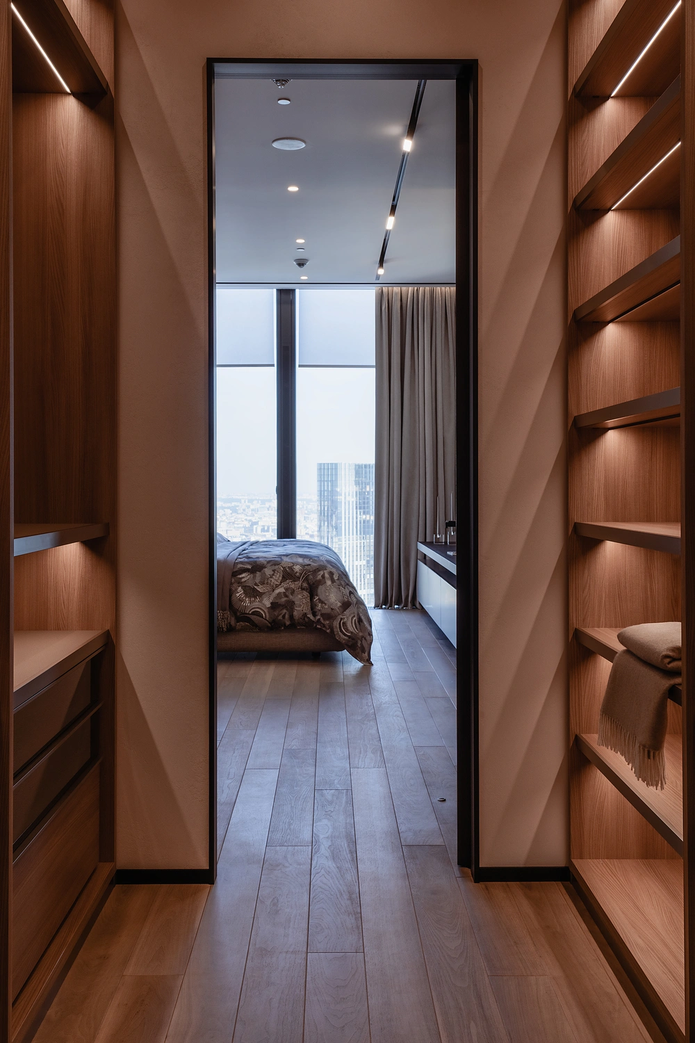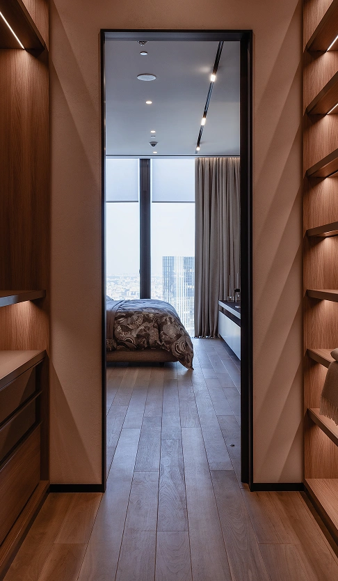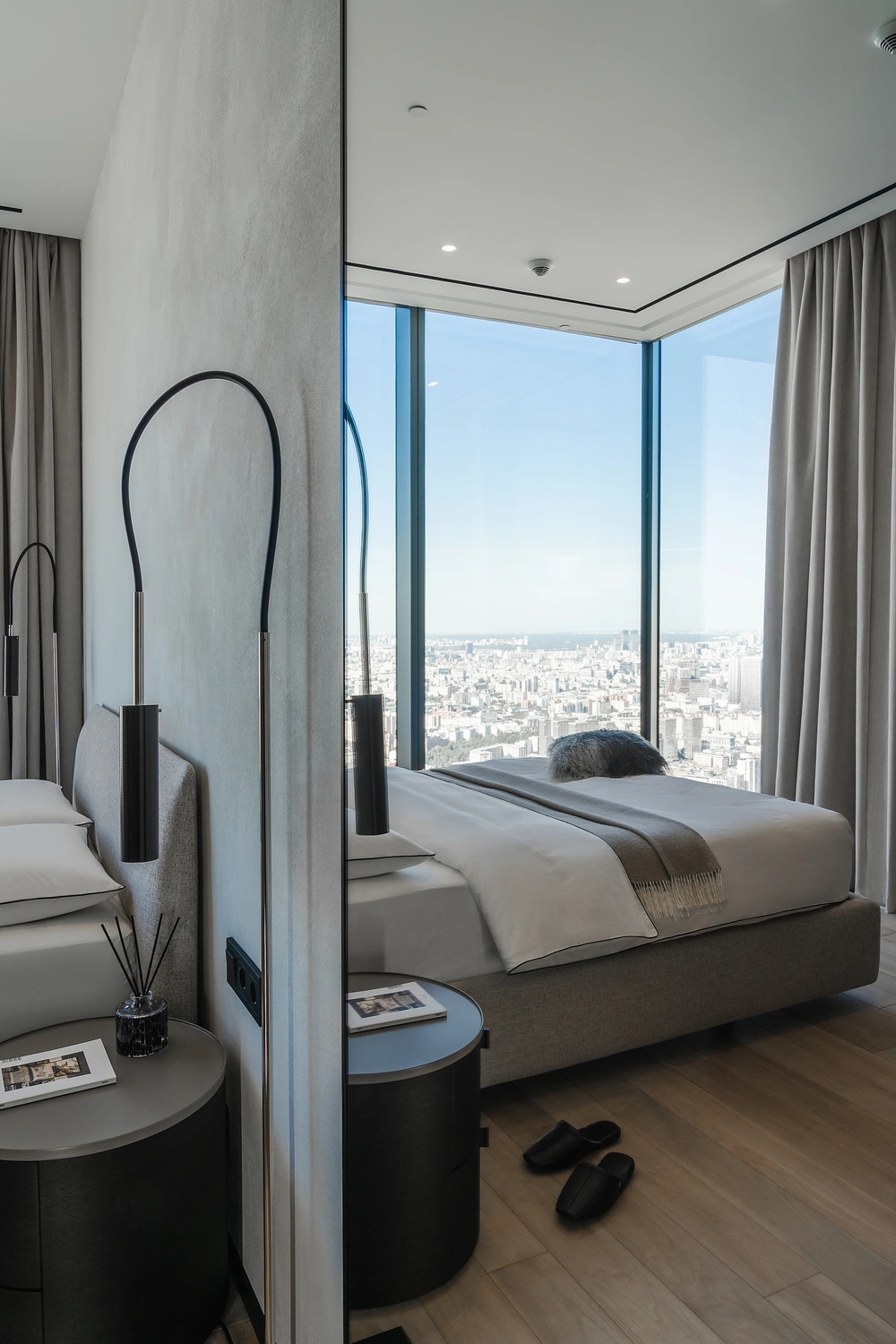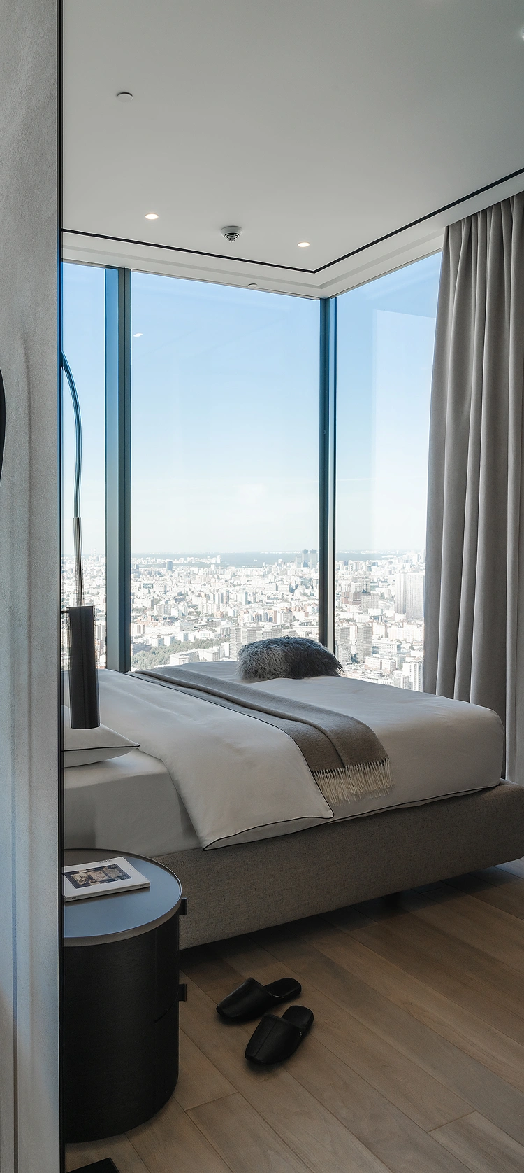 Текстильный декор изящно дополняет современный интерьер, превратив строгое минималистичное пространство в уютный городской оазис гармонии и безмятежности.