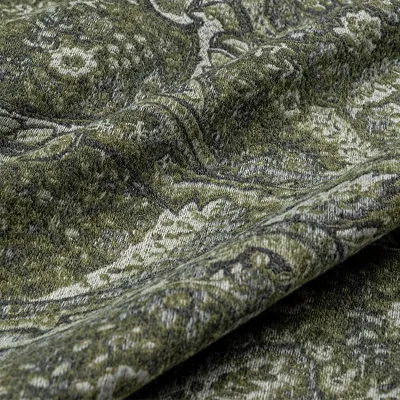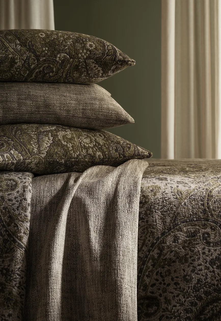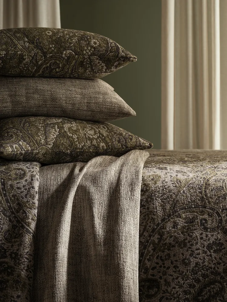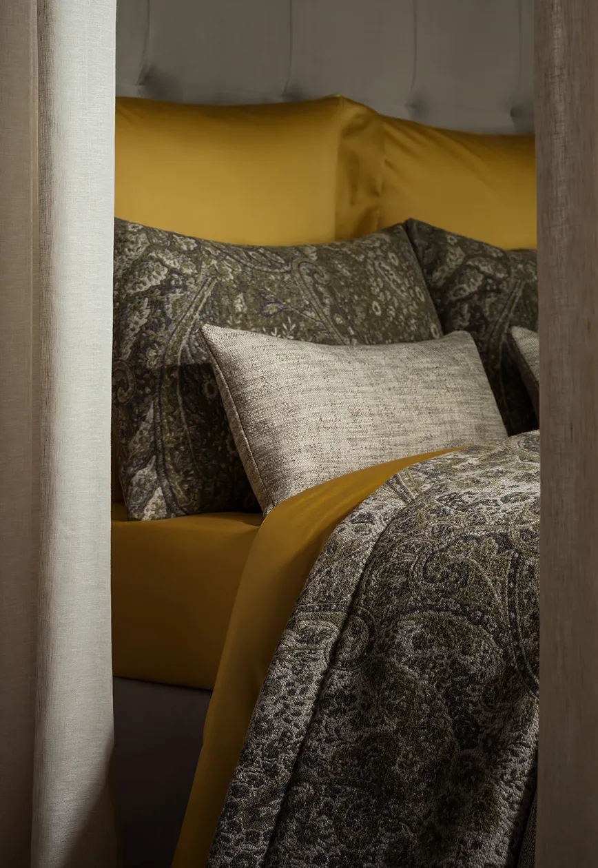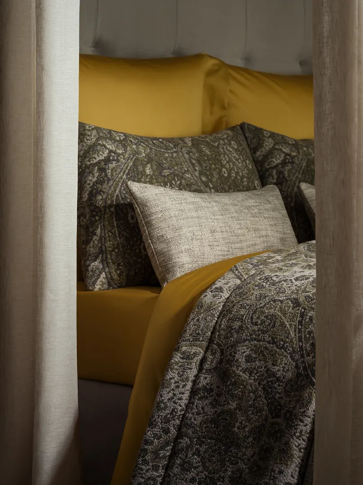 Жемчужина интерьера — спальня, подобная шкатулке с почти театральным текстильным декором в виде алькова из полупрозрачного льняного полотна LANDO Beige, в который заключена кровать с покрывалом и подушками из фантазийного шерстяного полотна ZEALOT Verde с орнаментом пейсли, дополненным постельным бельем в горчично-золотистом оттенке и пледом из хлопка ENBRUM Beige.