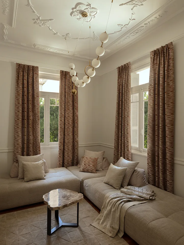 Шторы в терракотовой гамме из ткани NUAGE Flame с дизайном, воплощающим переосмысление традиционного восточного орнамента, перекликаются с текстурой исторического паркета, добавляя яркие акценты и драму в пастельную палитру пространства. Большой угловой диван в обивке из ткани с шерстяной нитью ZEALOT PLAIN Beige, плед из хлопкового полотна с длинным ворсом PRADIER и ковер с геометрическим орнаментом КУФРИ в песочном цвете создают разнообразие рельефов, насыщающих дизайн фактурами, усиливающими динамику интерьера.