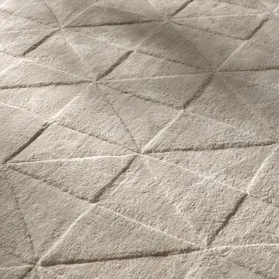 из хлопкового полотна с длинным ворсом PRADIER и ковер с геометрическим орнаментом КУФРИ в песочном цвете создают разнообразие рельефов, насыщающих дизайн фактурами, усиливающими динамику интерьера.