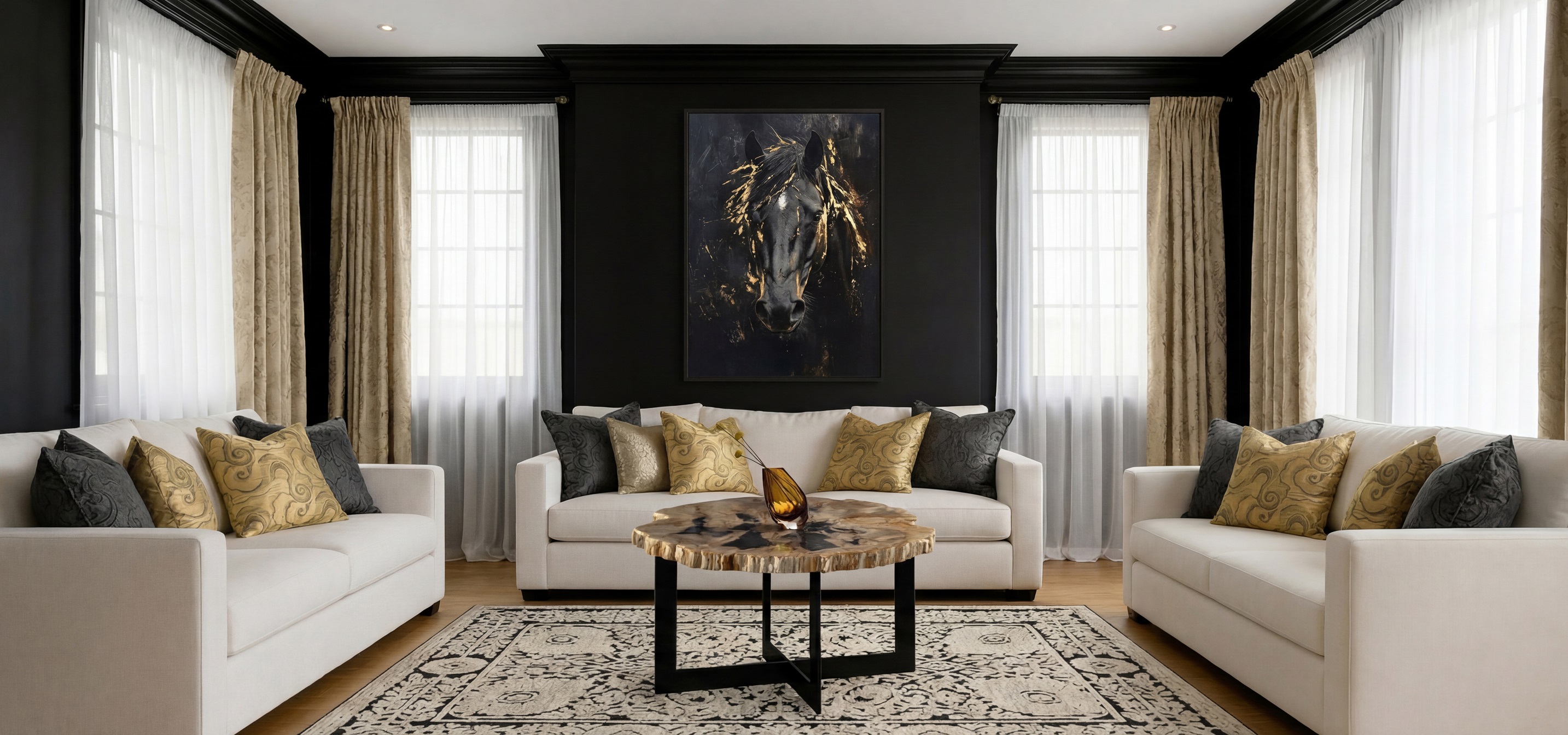В зените этой концепции — жаккард, чей тактильный аристократизм не знает равных. Коллекционные полотна AKANTH GOLD и RITMOS GOLD транслируют благородное сияние, оживающее в сложносочиненных фактурах портьер и аксессуаров. Драгоценные блики, филигранно подчеркнутые графитовым черным, превращают гостиную в сакральное пространство, где каждая деталь подчеркивает историческую преемственность и безупречный вкус владельца. Это интерьер, созданный не для созерцания, а для обладания.